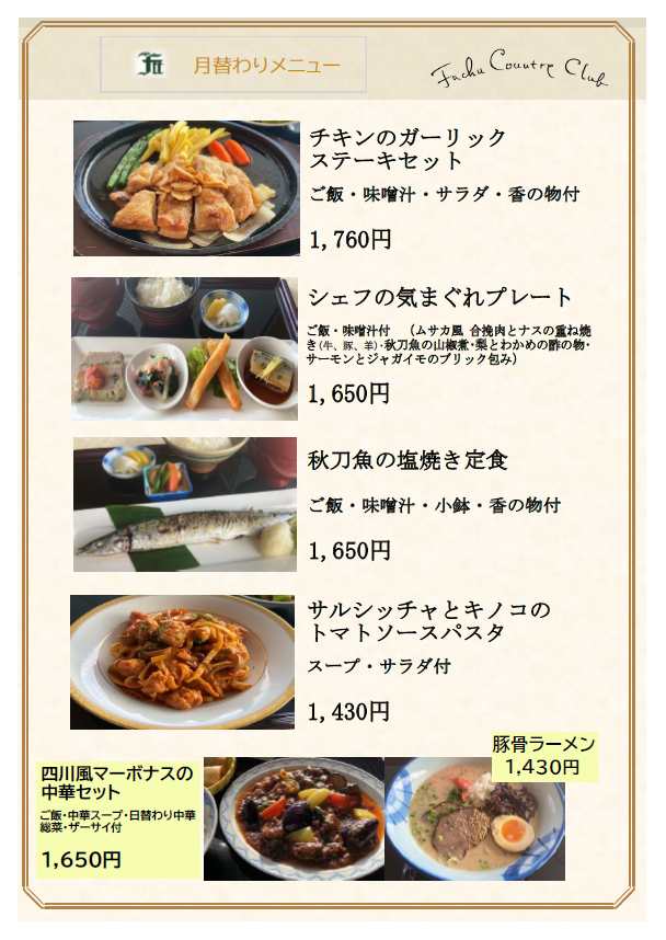 和洋中の美味しい料理を手頃な値段で提供します。 昼食だけでなく、アフタープレーのご歓談にもご利用ください。
